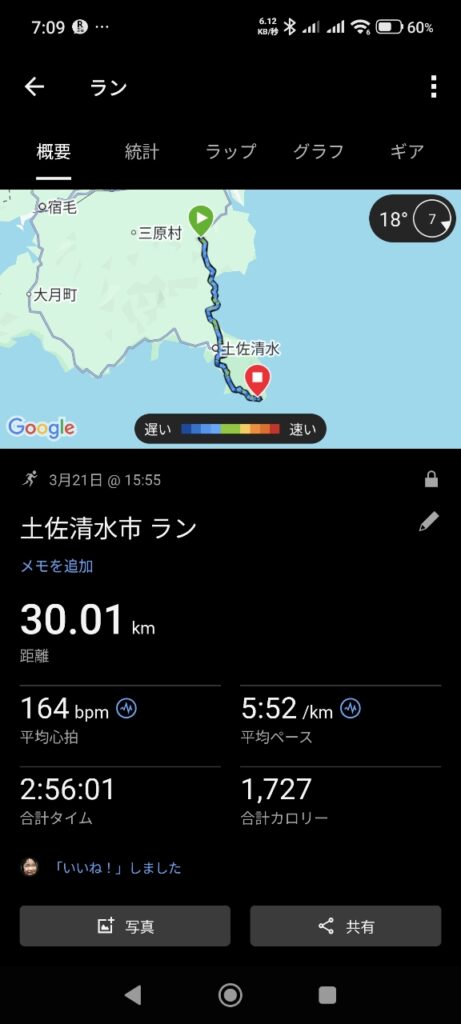 投稿日: 2026年4月7日2026年4月8日 投稿者: 電子ブレーカー西岡月間200km こんにちは!電子ブレーカー西岡です。 来年の龍馬マラソンに向けてトレーニングを続けてます。3月の月間走行距離は204kmでした。質より量ということでゆっくりでも距離を意識します。 最後に四万十市と土佐清水市の境から足摺岬まで走った記録を載せときます。